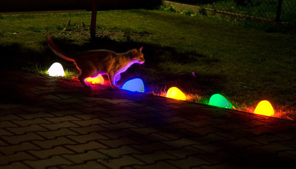 - Дизайнерские уличные фонари, такие модели могут выглядеть очень необычно (садовые фигуры с встроенной подсветкой, клумбы и прочее).